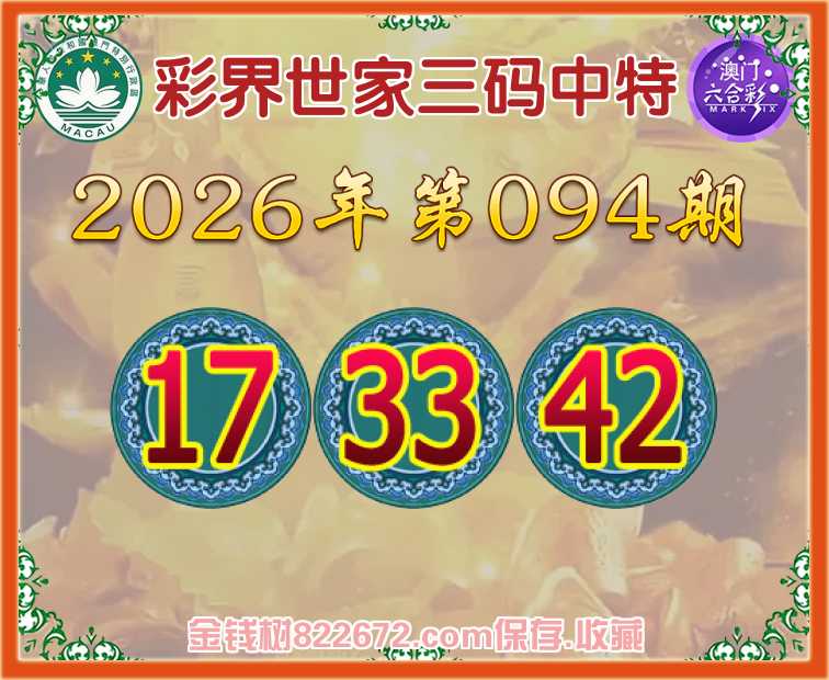 094期:《彩界世家》 😜三码中特😜【17.33.42】开:17准上榜高手